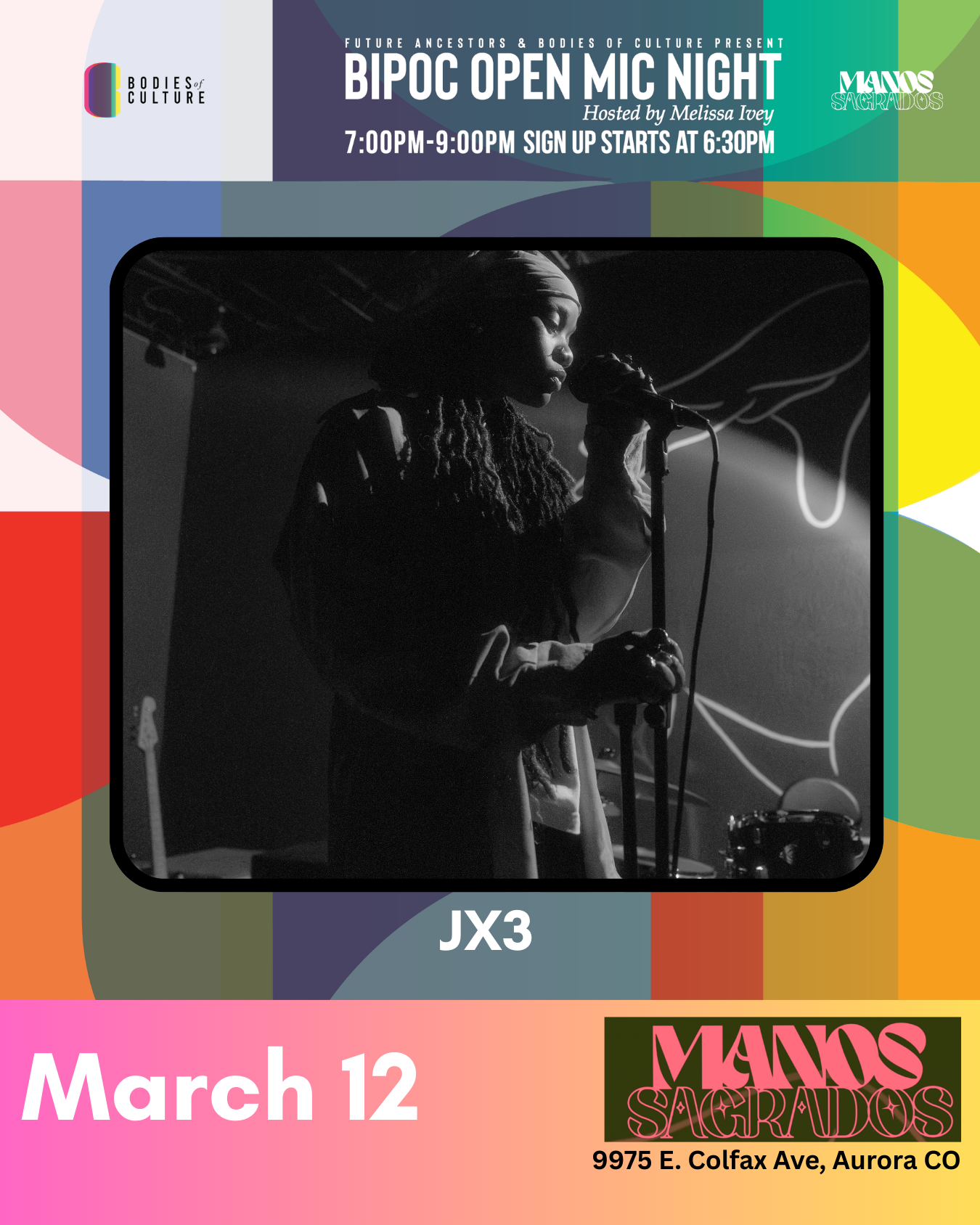 Join us for BOC’s monthly BIPOC Open Mic on Thursday, January 8th! Your favorite host, Melissa Ivey, takes over the Manos stage, featuring a talented lineup of up-and-coming artists, including BOC Mentorship alumni. See below for this month’s featured artist!